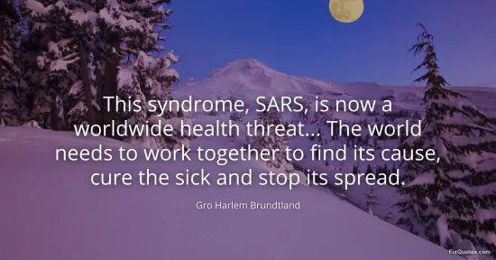 Brundtland, Gro Harlem. (2026, January 14). This syndrome, SARS, is now a worldwide health threat... The world needs to work together to find its cause, cure the sick and stop its spread. FixQuotes. https://fixquotes.com/quotes/this-syndrome-sars-is-now-a-worldwide-health-32705/
