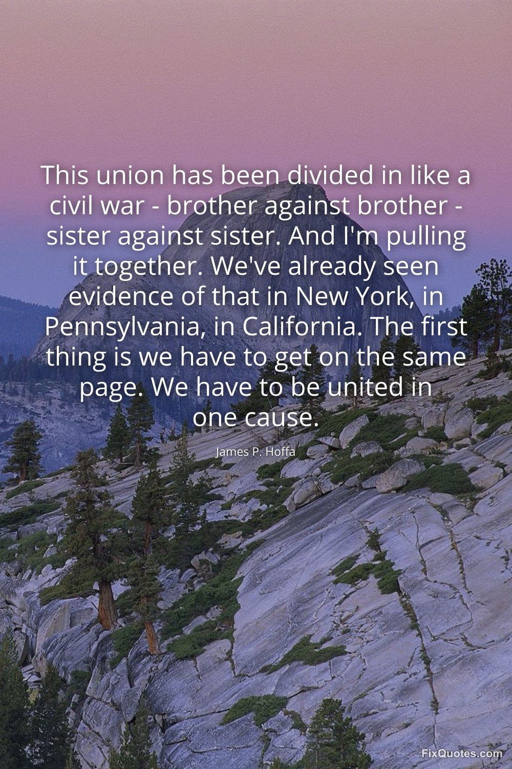 Hoffa, James P. (2026, January 15). This union has been divided in like a civil war - brother against brother - sister against sister. And I'm pulling it together. We've already seen evidence of that in New York, in Pennsylvania, in California. The first thing is we have to get on the same page. We have to be united in one cause. FixQuotes. https://fixquotes.com/quotes/this-union-has-been-divided-in-like-a-civil-war-154610/