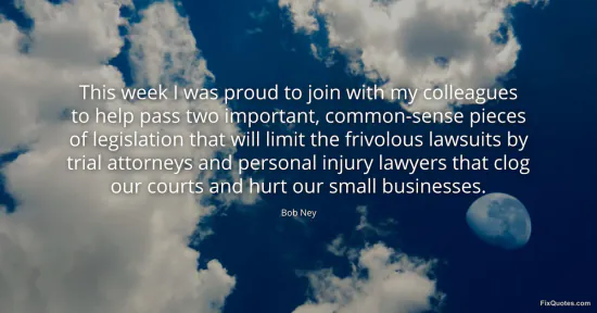 Ney, Bob. (2026, January 17). This week I was proud to join with my colleagues to help pass two important, common-sense pieces of legislation that will limit the frivolous lawsuits by trial attorneys and personal injury lawyers that clog our courts and hurt our small businesses. FixQuotes. https://fixquotes.com/quotes/this-week-i-was-proud-to-join-with-my-colleagues-72241/