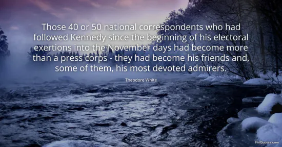 White, Theodore. "Those 40 or 50 national correspondents who had followed Kennedy since the beginning of his electoral exertions into the November days had become more than a press corps - they had become his friends and, some of them, his most devoted admirers." FixQuotes. January 16, 2026. https://fixquotes.com/quotes/those-40-or-50-national-correspondents-who-had-103935/.