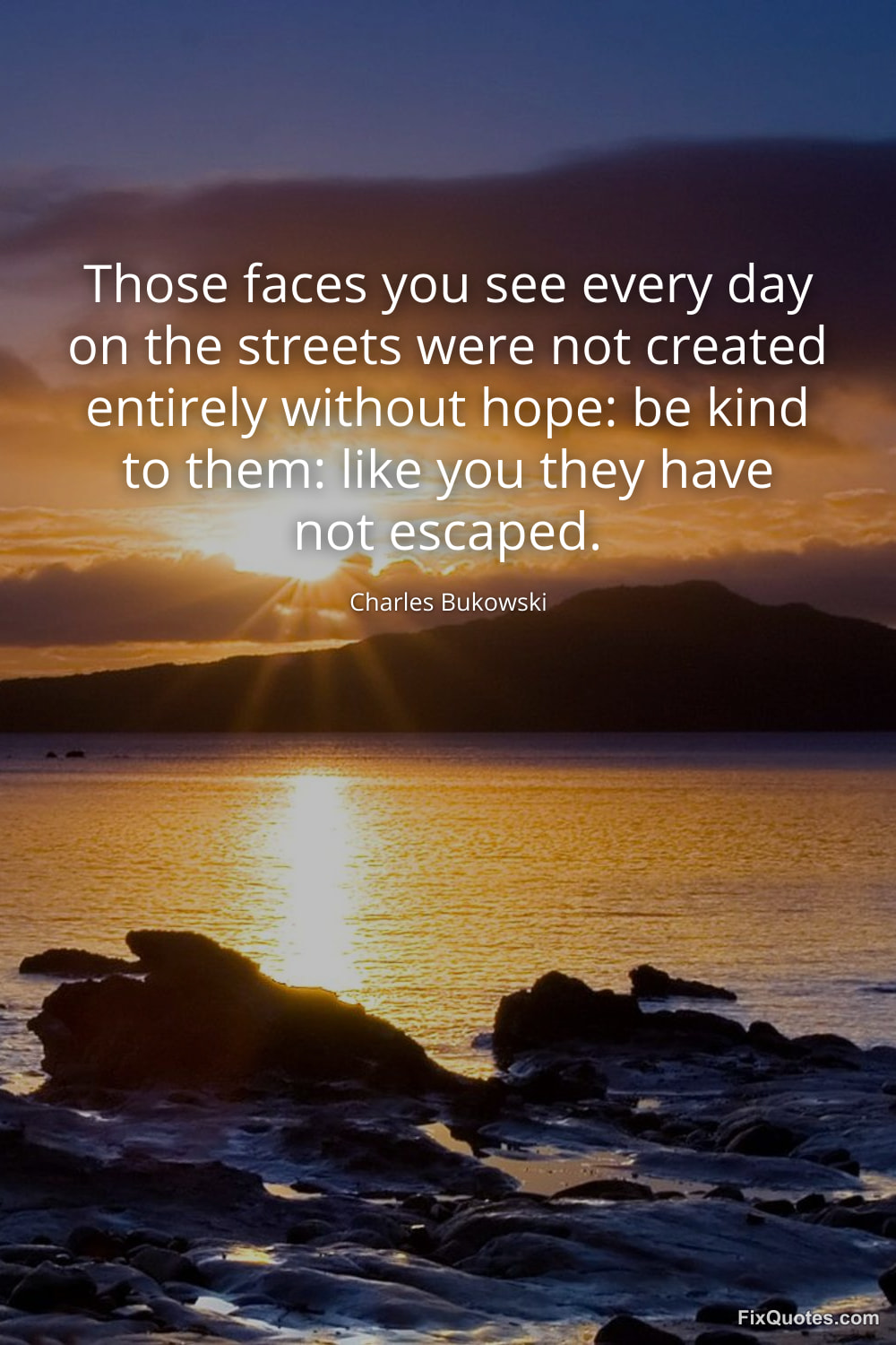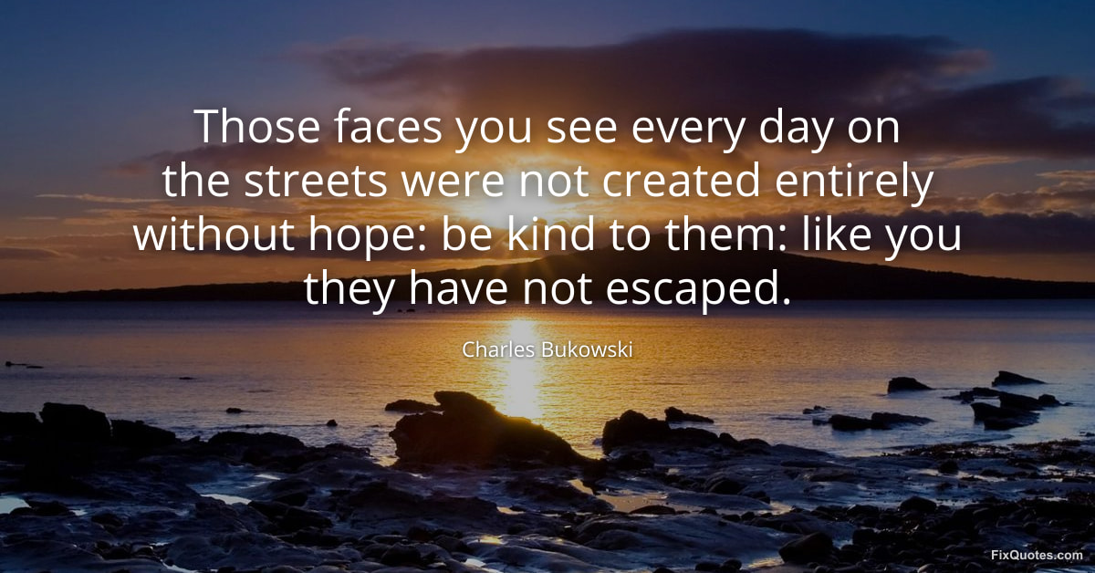 Bukowski, Charles. (2026, February 10). Those faces you see every day on the streets were not created entirely without hope: be kind to them: like you they have not escaped. FixQuotes. https://fixquotes.com/quotes/those-faces-you-see-every-day-on-the-streets-were-185187/