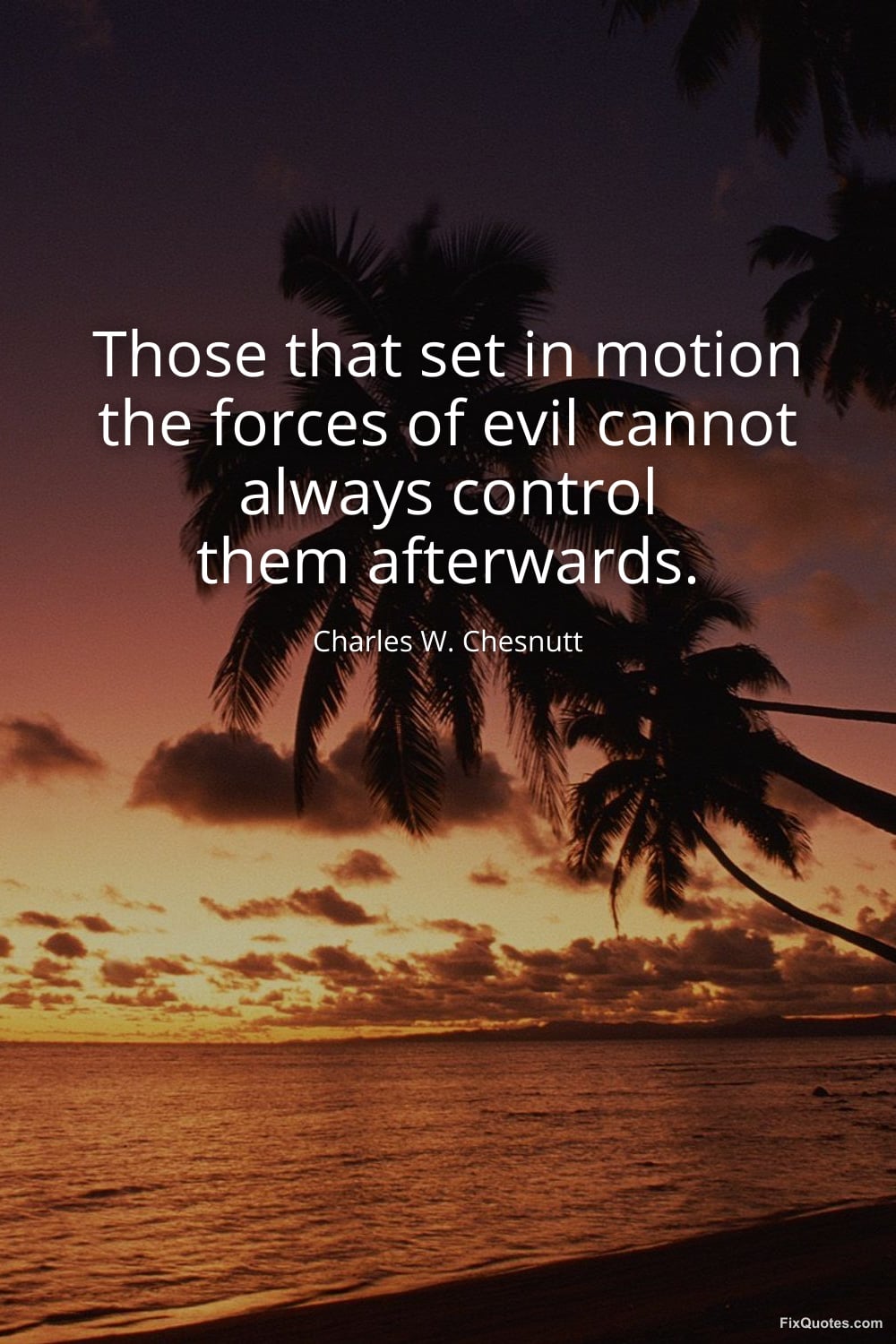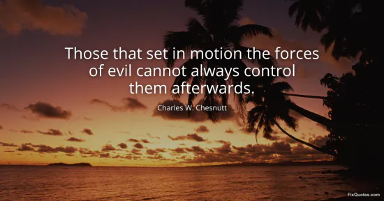 Chesnutt, Charles W. "Those that set in motion the forces of evil cannot always control them afterwards." FixQuotes. January 17, 2026. https://fixquotes.com/quotes/those-that-set-in-motion-the-forces-of-evil-40601/.