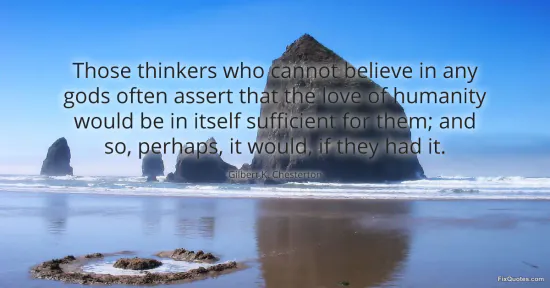 Chesterton, Gilbert K. "Those thinkers who cannot believe in any gods often assert that the love of humanity would be in itself sufficient for them; and so, perhaps, it would, if they had it." FixQuotes. January 15, 2026. https://fixquotes.com/quotes/those-thinkers-who-cannot-believe-in-any-gods-7413/.