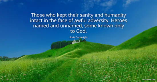 Cartwright, Silvia. (2026, January 15). Those who kept their sanity and humanity intact in the face of awful adversity. Heroes named and unnamed, some known only to God. FixQuotes. https://fixquotes.com/quotes/those-who-kept-their-sanity-and-humanity-intact-164561/
