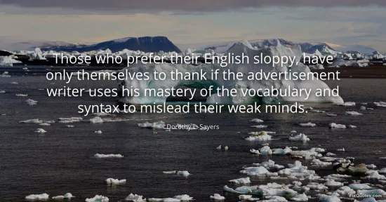 Sayers, Dorothy L. (2026, February 20). Those who prefer their English sloppy, have only themselves to thank if the advertisement writer uses his mastery of the vocabulary and syntax to mislead their weak minds. FixQuotes. https://fixquotes.com/quotes/those-who-prefer-their-english-sloppy-have-only-25896/