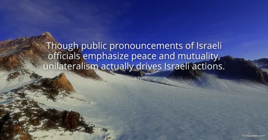 Feith, Douglas. "Though public pronouncements of Israeli officials emphasize peace and mutuality, unilateralism actually drives Israeli actions." FixQuotes. January 15, 2026. https://fixquotes.com/quotes/though-public-pronouncements-of-israeli-officials-143575/.