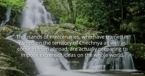 Yeltsin, Boris. "Thousands of mercenaries, who have trained in camps on the territory of Chechnya as well as come in from abroad, are actually preparing to impose extremist ideas on the whole world." FixQuotes. January 17, 2026. https://fixquotes.com/quotes/thousands-of-mercenaries-who-have-trained-in-46129/.