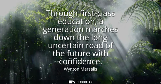 Wynton Marsalis links the promise of youth to the quality of the schooling they receive, and he does it in the language of movement. A generation does not stumble or drift; it marches. Marching implies rhythm, discipline, and shared purpose. The destination is unknown, the road is long, but the cadence gives strength, and the ensemble provides courage. Confidence is not bluster here. It is the earned steadiness that comes from mastery of fundamentals, exposure to tradition, and practice in working with others.