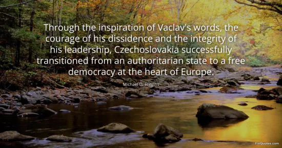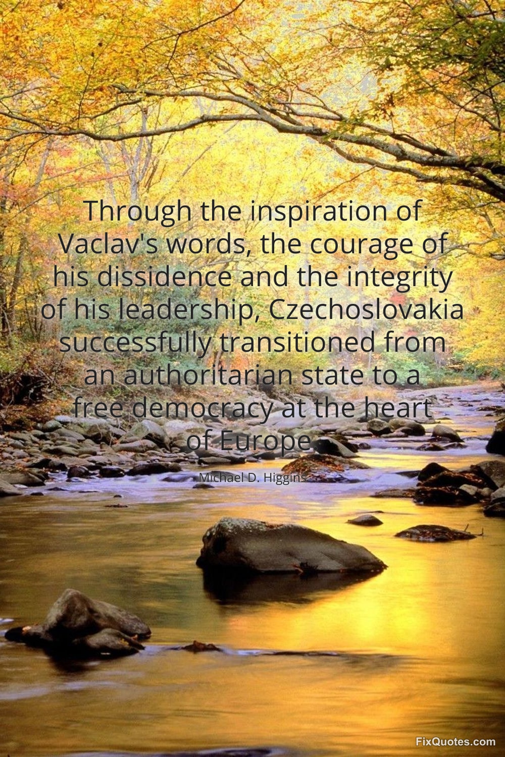 Higgins, Michael D. "Through the inspiration of Vaclav's words, the courage of his dissidence and the integrity of his leadership, Czechoslovakia successfully transitioned from an authoritarian state to a free democracy at the heart of Europe." FixQuotes. January 17, 2026. https://fixquotes.com/quotes/through-the-inspiration-of-vaclavs-words-the-70485/.