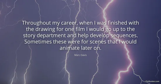 Davis, Marc. "Throughout my career, when I was finished with the drawing for one film I would go up to the story department and help develop sequences. Sometimes these were for scenes that I would animate later on." FixQuotes. January 17, 2026. https://fixquotes.com/quotes/throughout-my-career-when-i-was-finished-with-the-55988/.