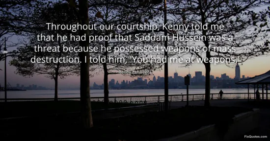 Zellweger, Renee. (2026, January 16). Throughout our courtship, Kenny told me that he had proof that Saddam Hussein was a threat because he possessed weapons of mass destruction. I told him, 'You had me at weapons.'. FixQuotes. https://fixquotes.com/quotes/throughout-our-courtship-kenny-told-me-that-he-107521/