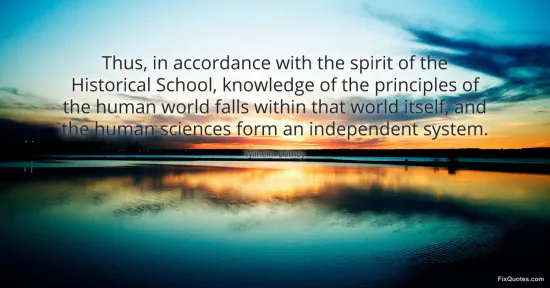 "Thus, in accordance with the spirit of the Historical School, knowledge of the principles of the human world falls within that world itself, and the human sciences form an independent system." FixQuotes, 15 Jan. 2026, https://fixquotes.com/quotes/thus-in-accordance-with-the-spirit-of-the-148289/. Accessed 12 Feb. 2026.