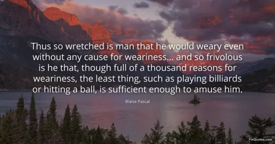 Pascal, Blaise. "Thus so wretched is man that he would weary even without any cause for weariness... and so frivolous is he that, though full of a thousand reasons for weariness, the least thing, such as playing billiards or hitting a ball, is sufficient enough to amuse him." FixQuotes. January 18, 2026. https://fixquotes.com/quotes/thus-so-wretched-is-man-that-he-would-weary-even-5092/.