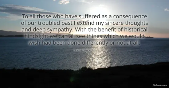 II, Queen Elizabeth. "To all those who have suffered as a consequence of our troubled past I extend my sincere thoughts and deep sympathy. With the benefit of historical hindsight we can all see things which we would wish had been done differently or not at all." FixQuotes. January 15, 2026. https://fixquotes.com/quotes/to-all-those-who-have-suffered-as-a-consequence-5455/.