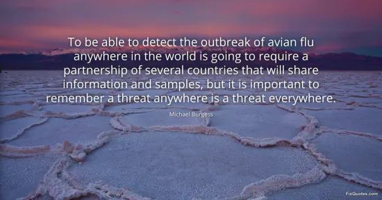 Burgess, Michael. "To be able to detect the outbreak of avian flu anywhere in the world is going to require a partnership of several countries that will share information and samples, but it is important to remember a threat anywhere is a threat everywhere." FixQuotes. January 16, 2026. https://fixquotes.com/quotes/to-be-able-to-detect-the-outbreak-of-avian-flu-97154/.