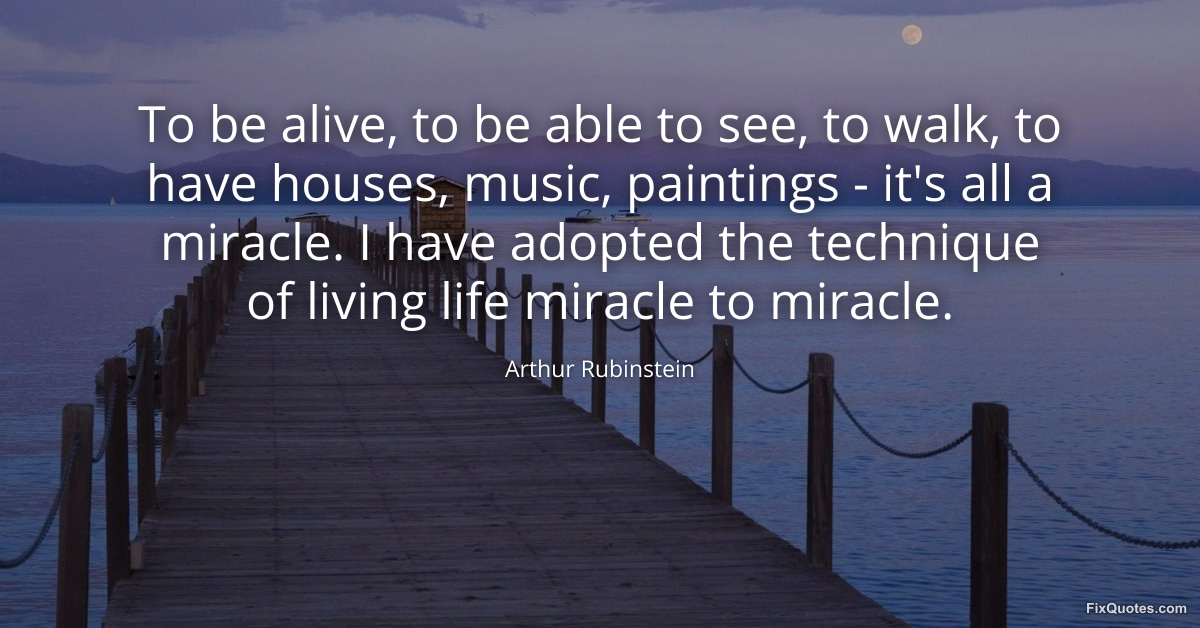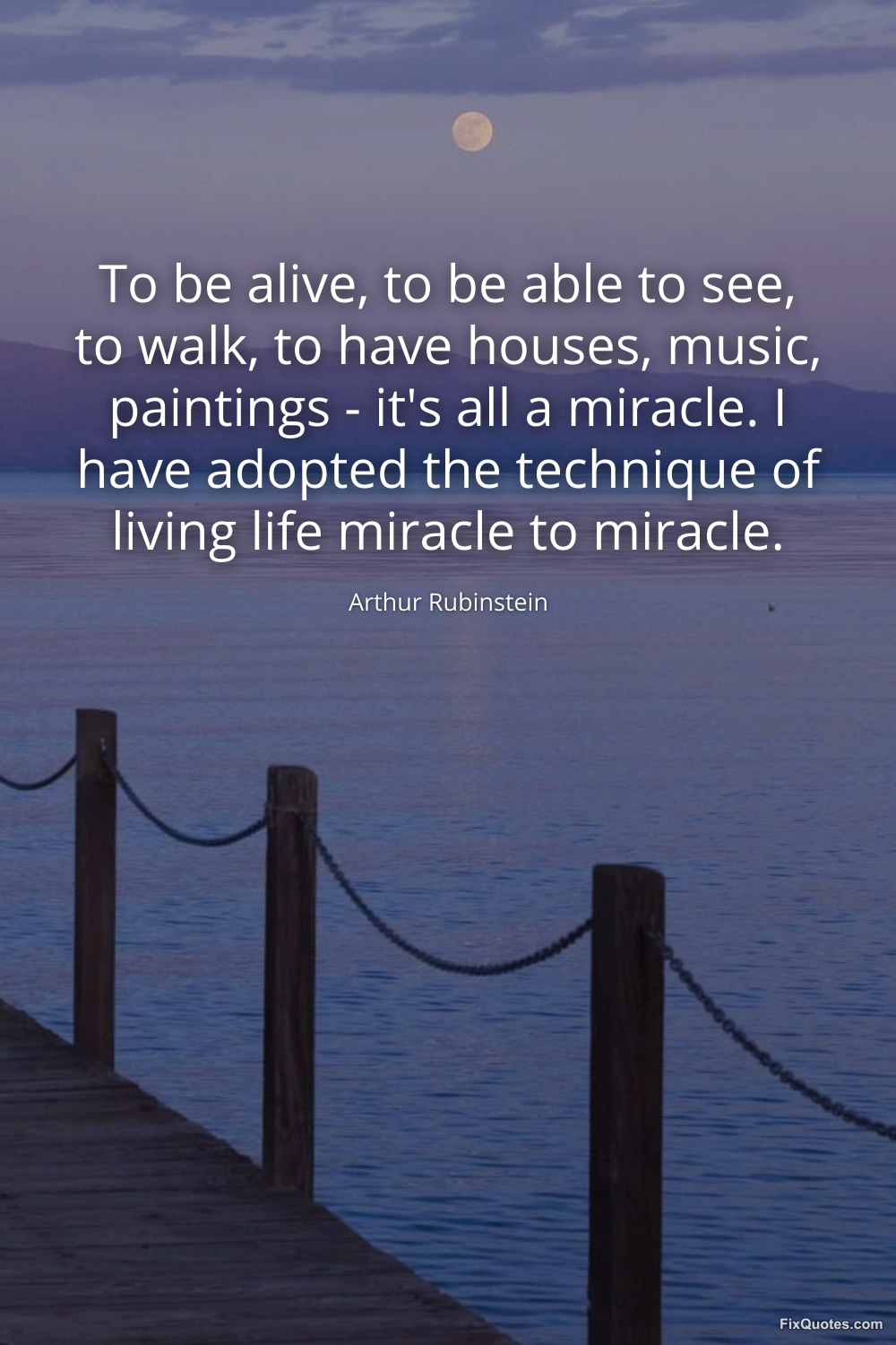 Rubinstein, Arthur. (2026, January 16). To be alive, to be able to see, to walk, to have houses, music, paintings - it's all a miracle. I have adopted the technique of living life miracle to miracle. FixQuotes. https://fixquotes.com/quotes/to-be-alive-to-be-able-to-see-to-walk-to-have-135950/