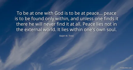 Trine, Ralph W. "To be at one with God is to be at peace... peace is to be found only within, and unless one finds it there he will never find it at all. Peace lies not in the external world. It lies within one's own soul." FixQuotes. January 15, 2026. https://fixquotes.com/quotes/to-be-at-one-with-god-is-to-be-at-peace-peace-is-160800/.