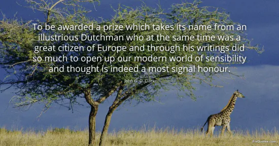 Clark, John G. D. "To be awarded a prize which takes its name from an illustrious Dutchman who at the same time was a great citizen of Europe and through his writings did so much to open up our modern world of sensibility and thought is indeed a most signal honour." FixQuotes. January 17, 2026. https://fixquotes.com/quotes/to-be-awarded-a-prize-which-takes-its-name-from-74941/.