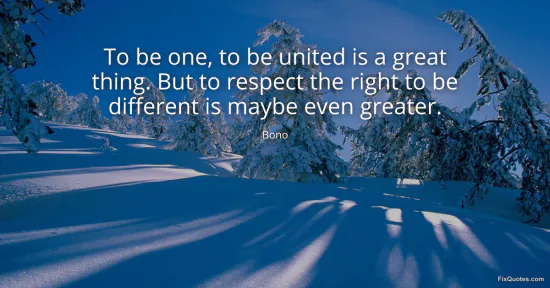 Bono. "To be one, to be united is a great thing. But to respect the right to be different is maybe even greater." FixQuotes. January 16, 2026. https://fixquotes.com/quotes/to-be-one-to-be-united-is-a-great-thing-but-to-109661/.