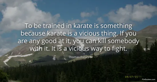 Karate gets framed here less as sport than as loaded technology: a skill that comes with an immediate moral shadow. Thomas Foran’s blunt repetition of “vicious” isn’t elegant, but it’s strategic. He’s trying to strip away the gym-poster version of martial arts - discipline, balance, self-improvement - and drag the listener back to the core fact: this is training for harm. The sentence structure does the work. Short clauses, direct verbs (“kill”), no metaphor. It reads like an intervention.