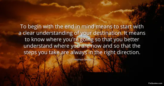 "To begin with the end in mind means to start with a clear understanding of your destination. It means to know where you're going so that you better understand where you are now and so that the steps you take are always in the right direction"