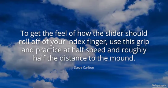 Carlton, Steve. "To get the feel of how the slider should roll off of your index finger, use this grip and practice at half speed and roughly half the distance to the mound." FixQuotes. January 16, 2026. https://fixquotes.com/quotes/to-get-the-feel-of-how-the-slider-should-roll-off-92100/.