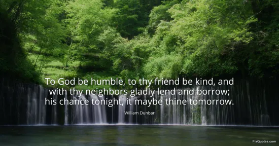 Dunbar, William. "To God be humble, to thy friend be kind, and with thy neighbors gladly lend and borrow; his chance tonight, it maybe thine tomorrow." FixQuotes. February 18, 2026. https://fixquotes.com/quotes/to-god-be-humble-to-thy-friend-be-kind-and-with-95906/.