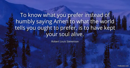 Stevenson, Robert Louis. (2026, January 18). To know what you prefer instead of humbly saying Amen to what the world tells you ought to prefer, is to have kept your soul alive. FixQuotes. https://fixquotes.com/quotes/to-know-what-you-prefer-instead-of-humbly-saying-20854/