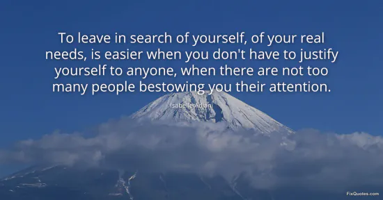 Adjani, Isabelle. (2026, January 15). To leave in search of yourself, of your real needs, is easier when you don't have to justify yourself to anyone, when there are not too many people bestowing you their attention. FixQuotes. https://fixquotes.com/quotes/to-leave-in-search-of-yourself-of-your-real-needs-151007/