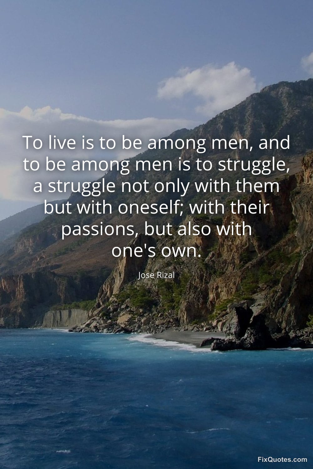 Rizal, Jose. "To live is to be among men, and to be among men is to struggle, a struggle not only with them but with oneself; with their passions, but also with one's own." FixQuotes. February 10, 2026. https://fixquotes.com/quotes/to-live-is-to-be-among-men-and-to-be-among-men-is-185075/.
