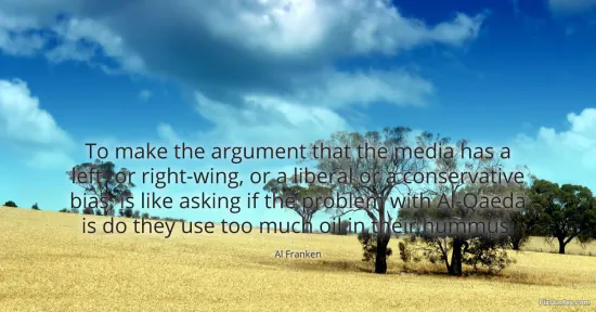 Franken, Al. "To make the argument that the media has a left- or right-wing, or a liberal or a conservative bias, is like asking if the problem with Al-Qaeda is do they use too much oil in their hummus." FixQuotes. January 17, 2026. https://fixquotes.com/quotes/to-make-the-argument-that-the-media-has-a-left-29553/.