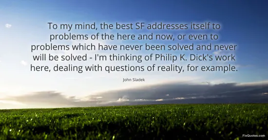 Sladek, John. (2026, January 15). To my mind, the best SF addresses itself to problems of the here and now, or even to problems which have never been solved and never will be solved - I'm thinking of Philip K. Dick's work here, dealing with questions of reality, for example. FixQuotes. https://fixquotes.com/quotes/to-my-mind-the-best-sf-addresses-itself-to-151842/