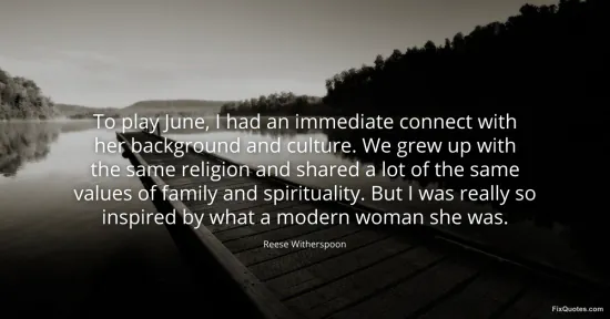 Witherspoon, Reese. "To play June, I had an immediate connect with her background and culture. We grew up with the same religion and shared a lot of the same values of family and spirituality. But I was really so inspired by what a modern woman she was." FixQuotes. January 17, 2026. https://fixquotes.com/quotes/to-play-june-i-had-an-immediate-connect-with-her-28701/.