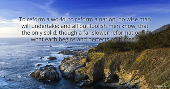 Carlyle, Thomas. "To reform a world, to reform a nation, no wise man will undertake; and all but foolish men know, that the only solid, though a far slower reformation, is what each begins and perfects on himself." FixQuotes. January 15, 2026. https://fixquotes.com/quotes/to-reform-a-world-to-reform-a-nation-no-wise-man-34572/.