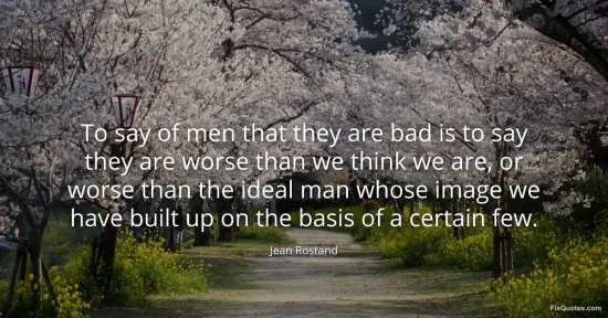 Rostand, Jean. (2026, January 18). To say of men that they are bad is to say they are worse than we think we are, or worse than the ideal man whose image we have built up on the basis of a certain few. FixQuotes. https://fixquotes.com/quotes/to-say-of-men-that-they-are-bad-is-to-say-they-16086/