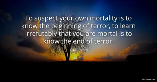 Herbert, Frank. "To suspect your own mortality is to know the beginning of terror, to learn irrefutably that you are mortal is to know the end of terror." FixQuotes. February 10, 2026. https://fixquotes.com/quotes/to-suspect-your-own-mortality-is-to-know-the-90805/.