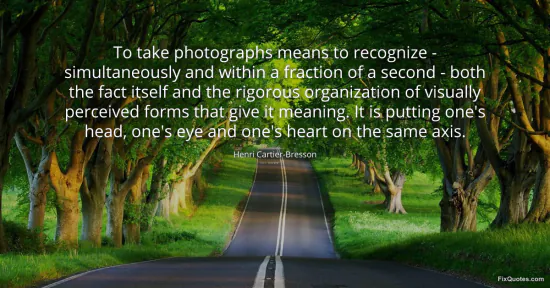"To take photographs means to recognize - simultaneously and within a fraction of a second - both the fact itself and the rigorous organization of visually perceived forms that give it meaning. It is putting one's head, one's eye and one's heart on the same axis." FixQuotes, 17 Jan. 2026, https://fixquotes.com/quotes/to-take-photographs-means-to-recognize-59697/. Accessed 19 Feb. 2026.