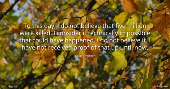 Streicher, Julius. "To this day, I do not believe that five million were killed. I consider it technically impossible that could have happened. I do not believe it. I have not received proof of that up until now." FixQuotes. January 17, 2026. https://fixquotes.com/quotes/to-this-day-i-do-not-believe-that-five-million-68556/.