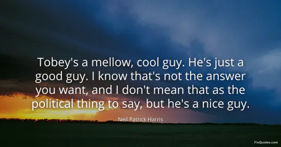 Harris, Neil Patrick. (2026, January 16). Tobey's a mellow, cool guy. He's just a good guy. I know that's not the answer you want, and I don't mean that as the political thing to say, but he's a nice guy. FixQuotes. https://fixquotes.com/quotes/tobeys-a-mellow-cool-guy-hes-just-a-good-guy-i-136625/