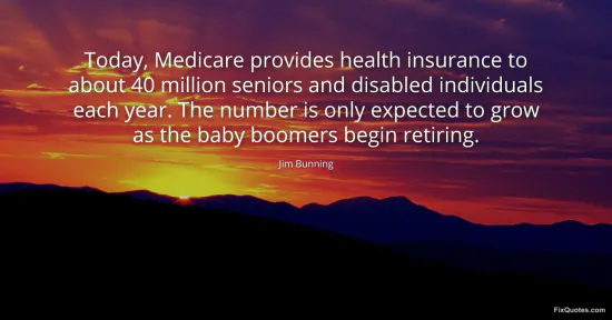 Bunning, Jim. "Today, Medicare provides health insurance to about 40 million seniors and disabled individuals each year. The number is only expected to grow as the baby boomers begin retiring." FixQuotes. January 15, 2026. https://fixquotes.com/quotes/today-medicare-provides-health-insurance-to-about-67996/.
