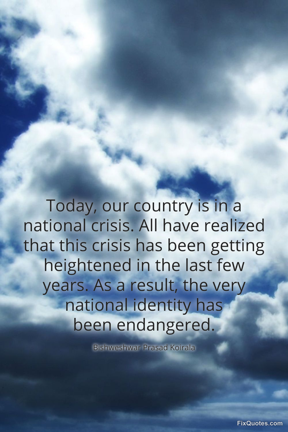 Koirala, Bishweshwar Prasad. (2026, February 16). Today, our country is in a national crisis. All have realized that this crisis has been getting heightened in the last few years. As a result, the very national identity has been endangered. FixQuotes. https://fixquotes.com/quotes/today-our-country-is-in-a-national-crisis-all-185450/