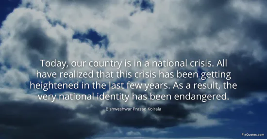 Koirala, Bishweshwar Prasad. "Today, our country is in a national crisis. All have realized that this crisis has been getting heightened in the last few years. As a result, the very national identity has been endangered." FixQuotes. February 16, 2026. https://fixquotes.com/quotes/today-our-country-is-in-a-national-crisis-all-185450/.