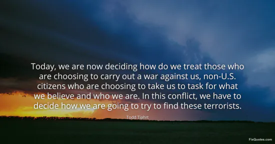 Tiahrt, Todd. (2026, January 16). Today, we are now deciding how do we treat those who are choosing to carry out a war against us, non-U.S. citizens who are choosing to take us to task for what we believe and who we are. In this conflict, we have to decide how we are going to try to find these terrorists. FixQuotes. https://fixquotes.com/quotes/today-we-are-now-deciding-how-do-we-treat-those-105432/