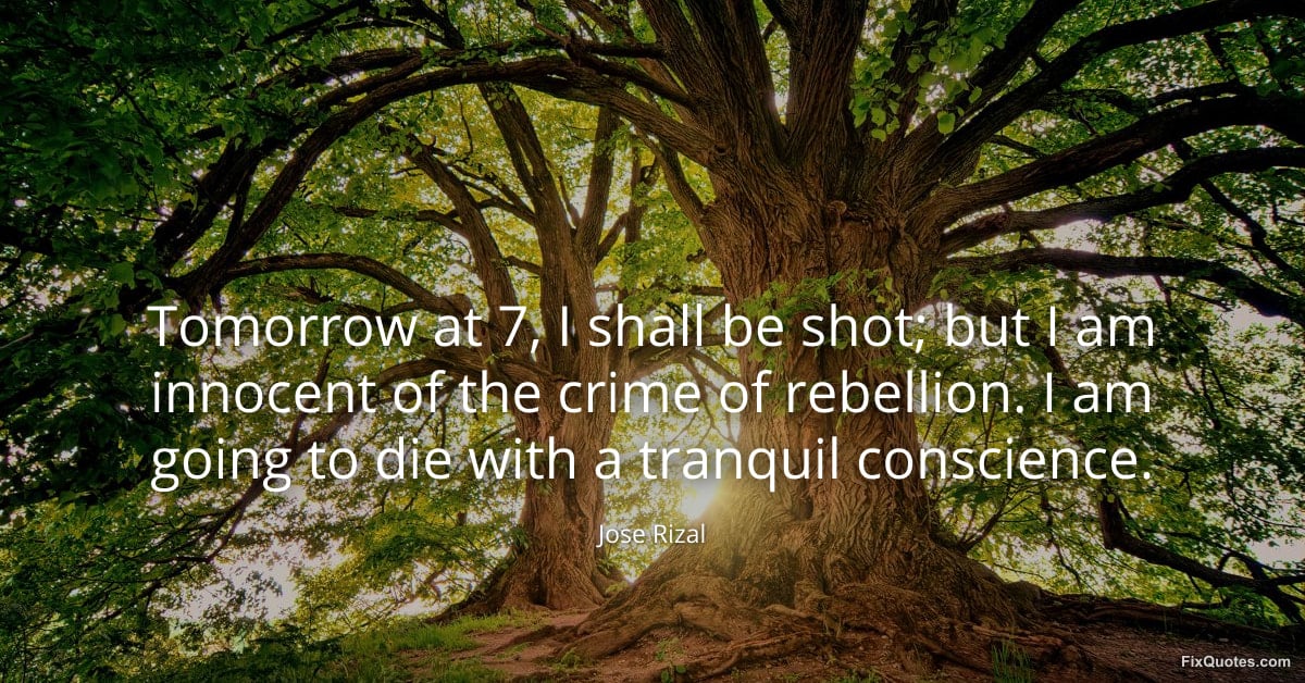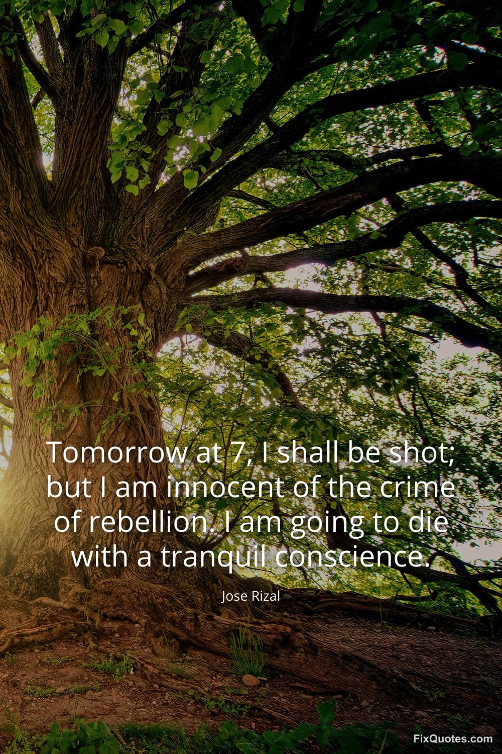 Rizal, Jose. "Tomorrow at 7, I shall be shot; but I am innocent of the crime of rebellion. I am going to die with a tranquil conscience." FixQuotes. February 10, 2026. https://fixquotes.com/quotes/tomorrow-at-7-i-shall-be-shot-but-i-am-innocent-185087/.