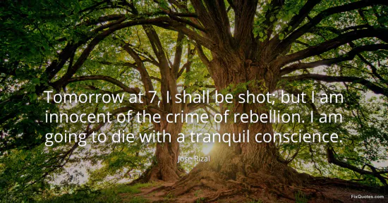 Rizal, Jose. (2026, February 10). Tomorrow at 7, I shall be shot; but I am innocent of the crime of rebellion. I am going to die with a tranquil conscience. FixQuotes. https://fixquotes.com/quotes/tomorrow-at-7-i-shall-be-shot-but-i-am-innocent-185087/