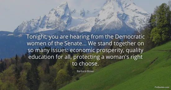 Boxer, Barbara. (2026, January 17). Tonight, you are hearing from the Democratic women of the Senate... We stand together on so many issues: economic prosperity, quality education for all, protecting a woman's right to choose. FixQuotes. https://fixquotes.com/quotes/tonight-you-are-hearing-from-the-democratic-women-43126/