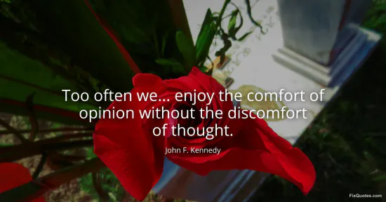Kennedy, John F. (2026, February 26). Too often we... enjoy the comfort of opinion without the discomfort of thought. FixQuotes. https://fixquotes.com/quotes/too-often-we-enjoy-the-comfort-of-opinion-without-36502/