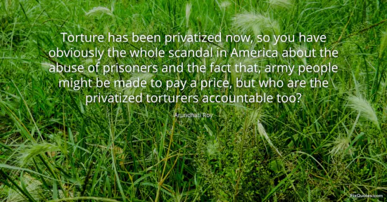 Roy, Arundhati. "Torture has been privatized now, so you have obviously the whole scandal in America about the abuse of prisoners and the fact that, army people might be made to pay a price, but who are the privatized torturers accountable too?" FixQuotes. January 17, 2026. https://fixquotes.com/quotes/torture-has-been-privatized-now-so-you-have-36917/.