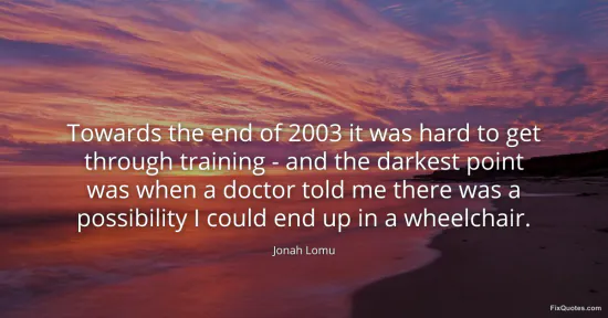 Lomu, Jonah. (2026, January 17). Towards the end of 2003 it was hard to get through training - and the darkest point was when a doctor told me there was a possibility I could end up in a wheelchair. FixQuotes. https://fixquotes.com/quotes/towards-the-end-of-2003-it-was-hard-to-get-61282/