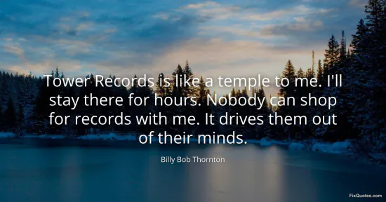 Thornton, Billy Bob. (2026, January 15). Tower Records is like a temple to me. I'll stay there for hours. Nobody can shop for records with me. It drives them out of their minds. FixQuotes. https://fixquotes.com/quotes/tower-records-is-like-a-temple-to-me-ill-stay-141520/